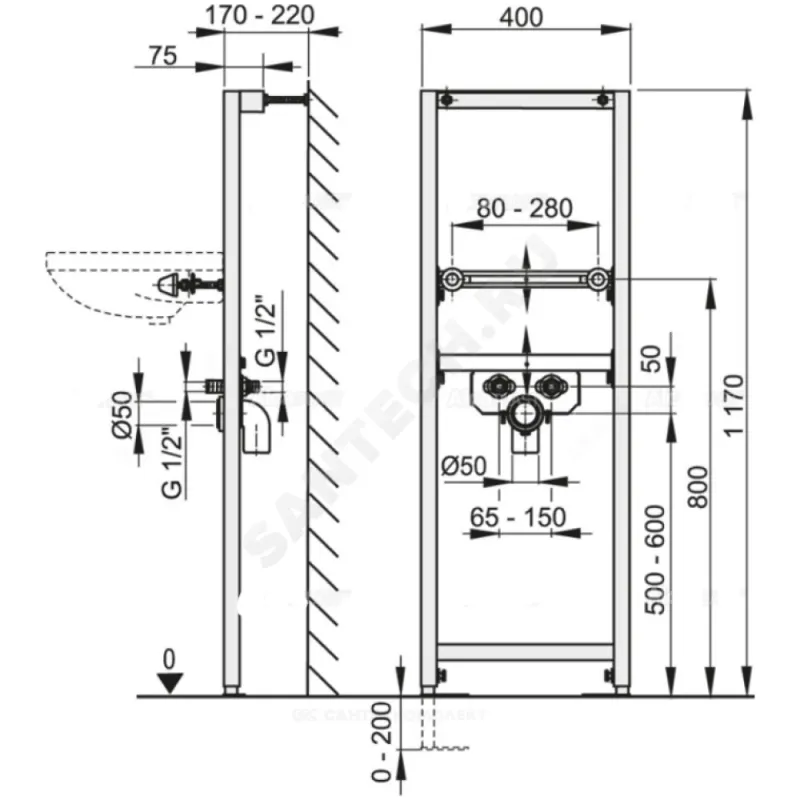 | Комплект поставки | Рама, монтажный комплект: винт 8х60 – 4 шт., дюбель 12 – 4 шт., монтажный комплект для крепления раковины: винт М10х100 – 2 шт., колпаки для закрытия гаек, резьбовое соединение для подключения воды: G1/2"–G1/2", стоковое колено HT50 с прокладкой |
