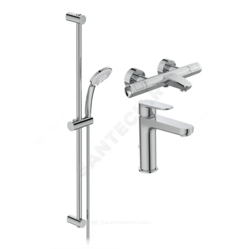 CERATHERM T100 промо комплект, состоящий из:A7238AA Ceratherm T100 Настенный термостатический смеситель для ванны/душа, скрытый монтаж на эксцентрикахтермостатический картридж IS, новая технология, затворы на керамических дисках G1/2 180гртехнология "Cool body" ("Холодный корпус")металлические рукоятки с ограничителями температуры (40oC) и потока воды (50%)встроенный обратный клапанпереключатель интегрирован в корпусаэратор PerlatorBC699AA CERAFINE O Однорычажный смеситель для раковины с металлическим донным клапаномсистема облегченного монтажа EasyFixлитой излив, длина излива 126 мм, высота 118 ммаэратор Perlator с ограничением потока 5 л/минкерамический картридж 28 мм FirmaFlow, с функцией HWTC (ограничение максимальной температуры горячей воды)металлическая рукояткагибкая подводка G3/8"BC797AA IDEALRAIN Душевой гарнитур, состоящий из 3-функ.лейки 100ммштанги 900 ммшланга Idealflex 1600мм